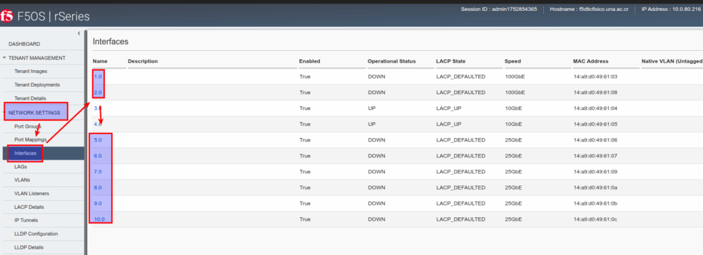 - menú -> NETWORK SETTING -> Interfaces -> cada interfaz