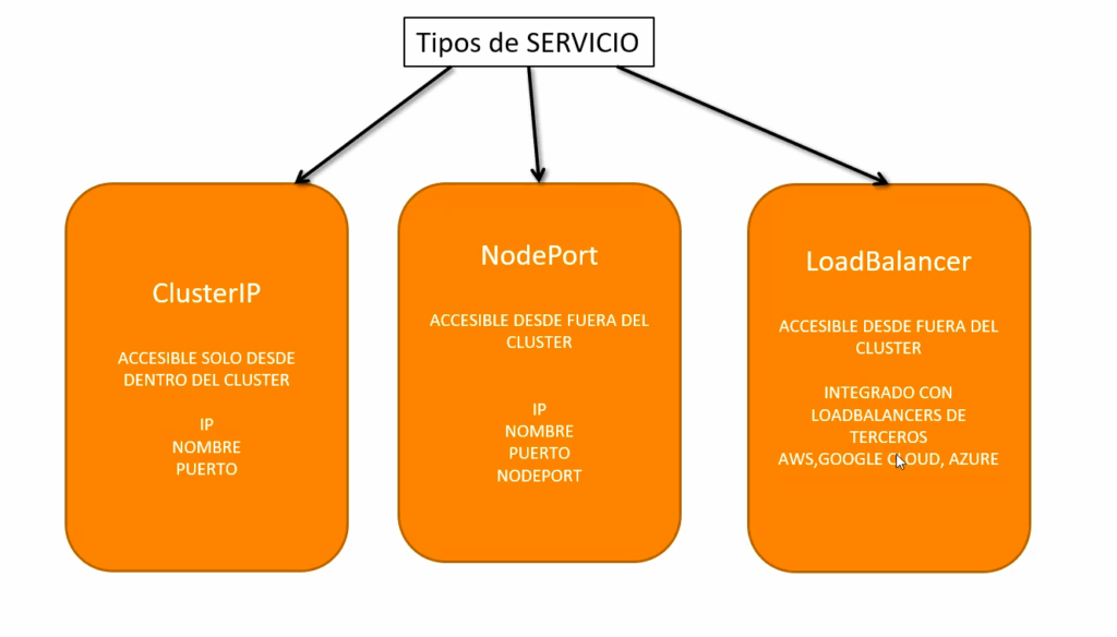 - LoadBalancer: para servicios basados en nube donde se conectan a Loadbalancer de servicios como aws, google cloud,etc