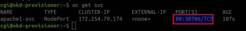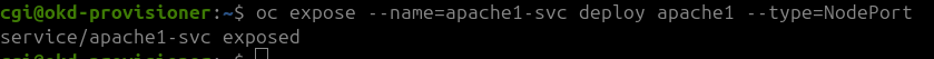 oc expose --name=apache1-svc deploy apache1 --type=NodePort