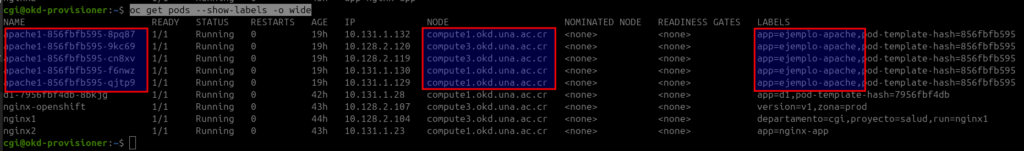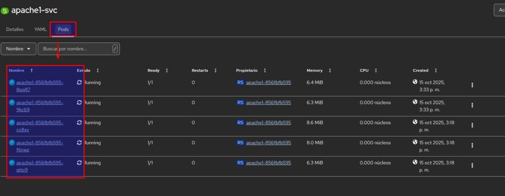 - Y si vamos a pods podemos ver los pods que tienen la etiqueta app=ejemplo-apache