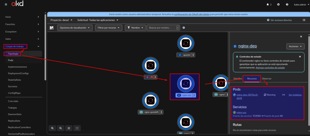 - Tambien podriamos ingresar a Cargas de trabajo -> Topologia -> deploy: nginx-dep -> Recursos