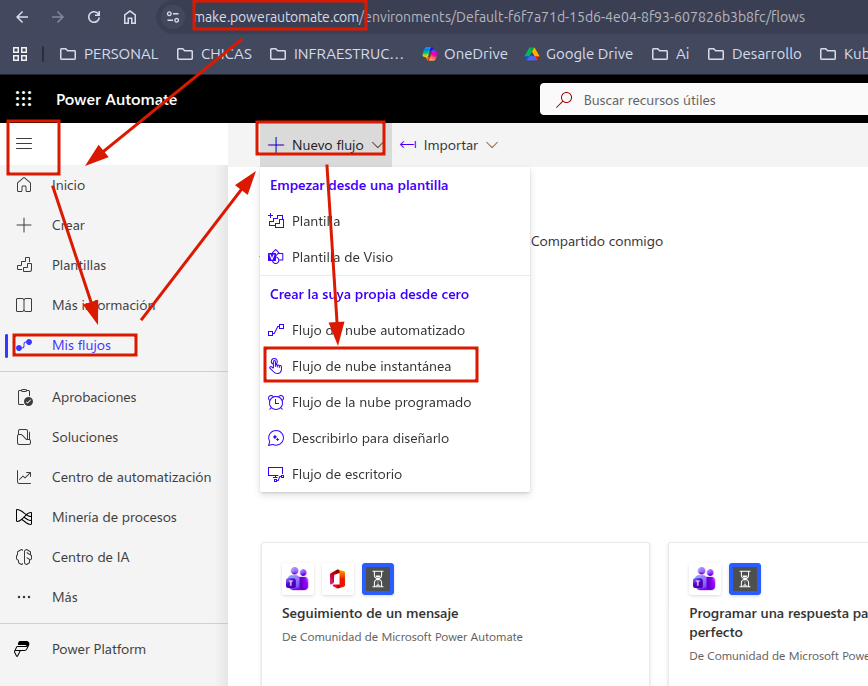 - Ingresamos a mis flujos-> Nuevo -> Flujo de nube instantáneo