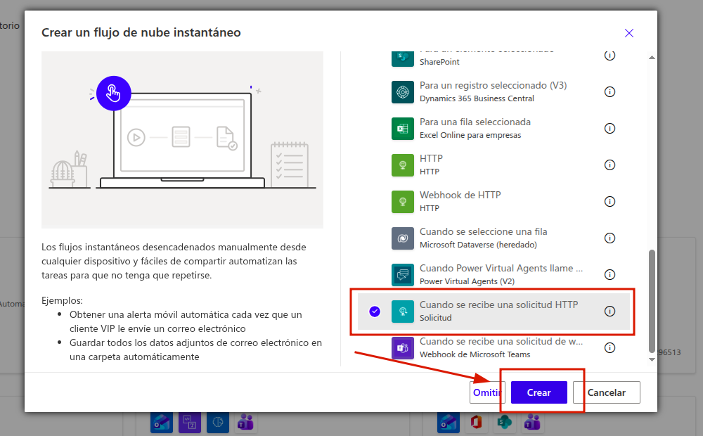 - Seleccionamos la opción Cuando se recibe una solicitud HTTP