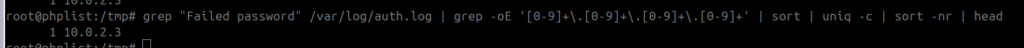 grep "Failed password" /var/log/auth.log | grep -oE '[0-9]+\.[0-9]+\.[0-9]+\.[0-9]+' | sort | uniq -c | sort -nr | head