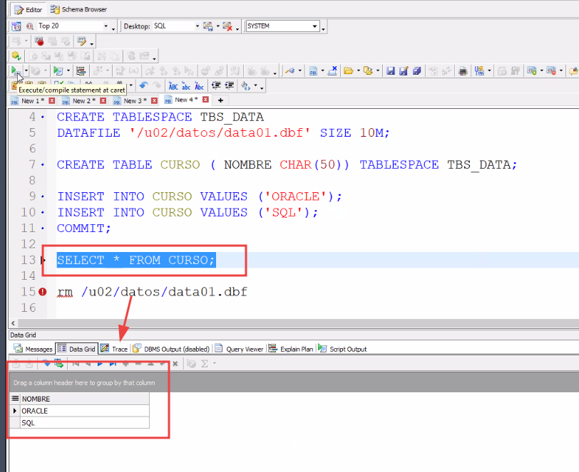 CREATE TABLE CURSO ( NOMBRE CHAR(50)) TABLESPACE TBS_DATA;