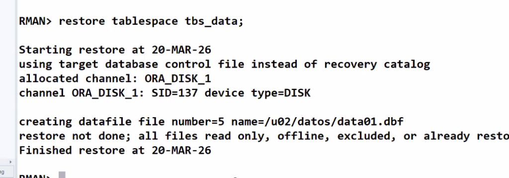 RMAN> RESTORE TABLESPACE TBS_DATA;