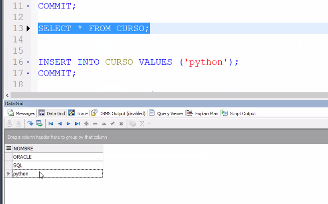 SQL> SELECT * FROM CURSO;