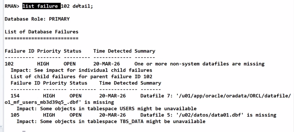list failure 102 detail;