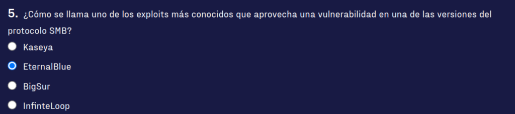 1) Uno de los exploits más conocidos es el denominado Eternalblue, el cual aprovechaba una vulnerabilidad en la implementación del protocolo SMB que daba acceso al sistema Windows al atacante. Fue el utilizado en los ataques del ransomware WannaCry en 2017 que paralizó al mundo. Este exploit aparentemente fue robado a la Agencia Nacional de Seguridad de los Estados Unidos en 2016 y se filtró en 2017.